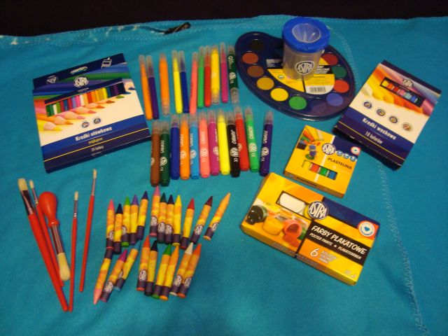 W tej pracy i zabawie wspiera nas ASTRA, producent najlepszej plasteliny i farb. Tylko z nich korzystamy. Do tej pory nie mieliśmy okazji poeksperymentować z kredkami i mazakami. Dzieciom się bardzo podobało. Grube flamastry z pieczątkami zrobiły furorę. Gwiazdki i buźki są po prostu wszędzie! Plastikowe palety do farb sprawiły, że dzieci poczuły się prawdziwymi artystami malarzami. Duży pędzel zakończony nieostro dał gwarancję bezpiecznej zabawy. Kilogramy różnych kolorów plasteliny oraz połyskujący brokat dają nieograniczone możliwości rozwijania kreatywności małych rączek.